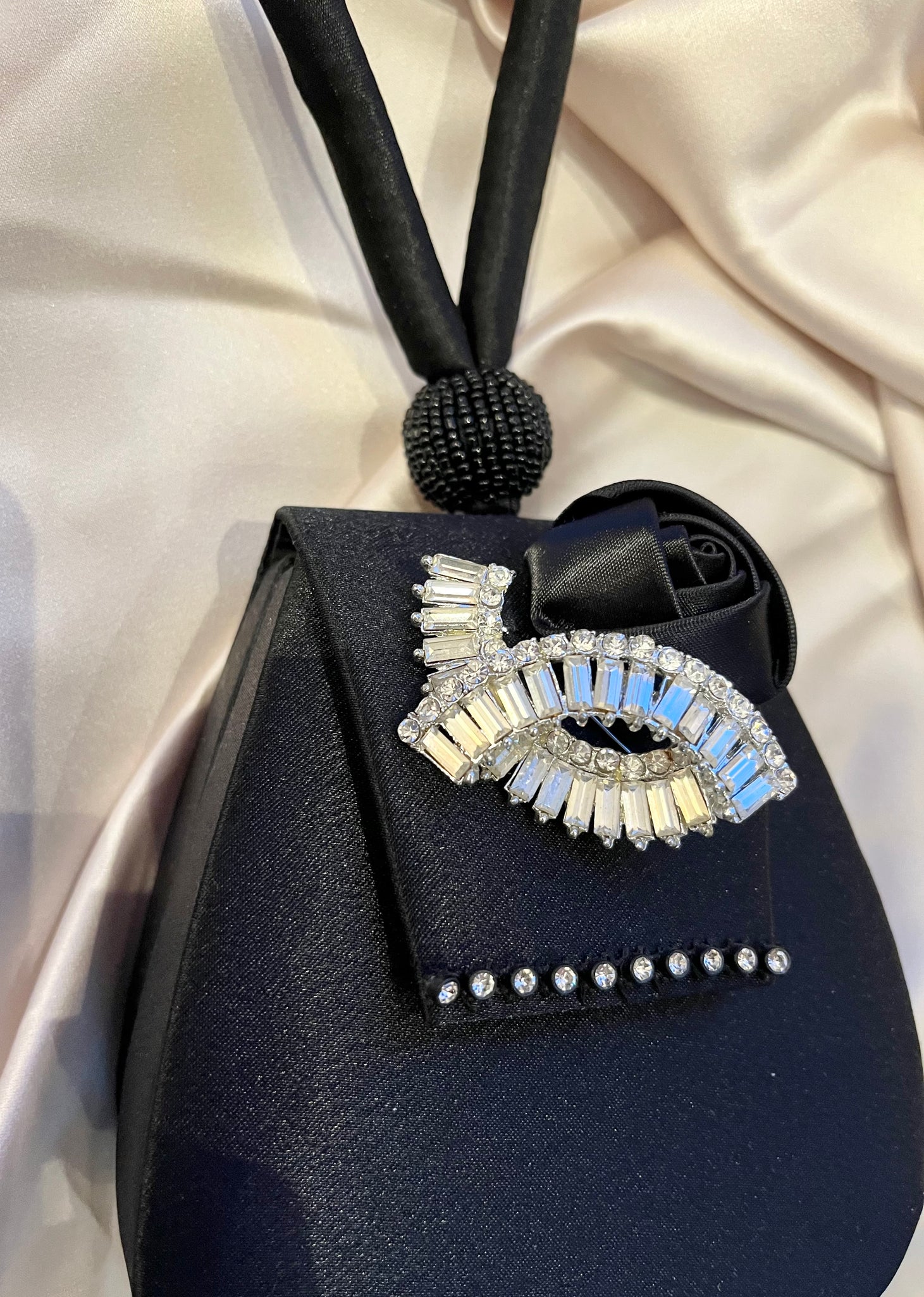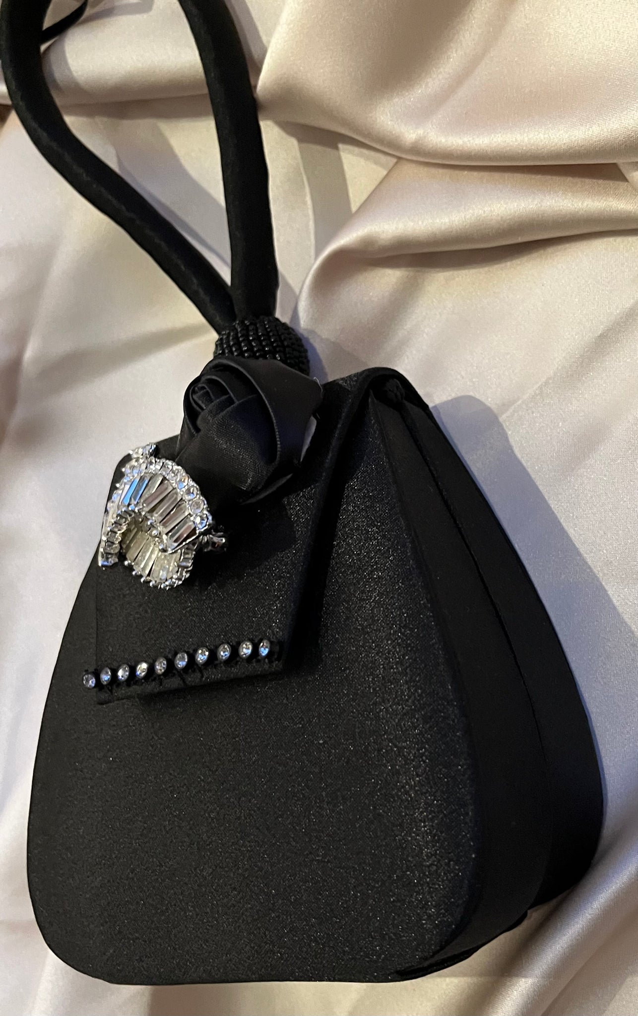 Simply, gorgeous! A stunning black satin bag - with an unique opening, exceptional quality. This is a newer bag with a vintage rhinestone pin. The tear drop portion of the bag is 4.5" x 5"